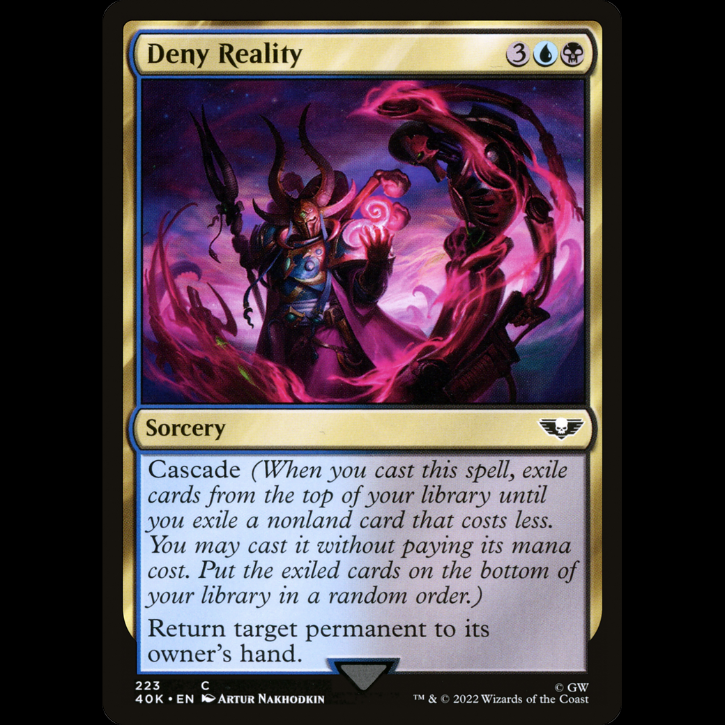 MTG Deny Reality Warhammer 40,000 Commander 40k#223 Cascade (When you cast this spell, exile cards from the top of your library until you exile a nonland card that costs less. You may cast it without paying its mana cost. Put the exiled cards on the bottom in a random order.) Return target permanent to its owner's hand.