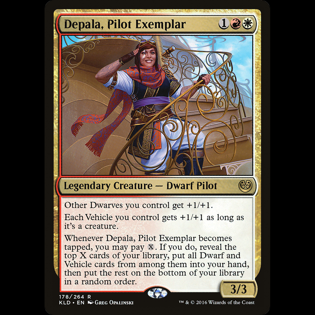 Whenever Depala, Pilot Exemplar becomes tapped, you may pay . If you do, reveal the top X cards of your library, put all Dwarf and Vehicle cards from among them into your hand, then put the rest on the bottom of your library in a random order.
