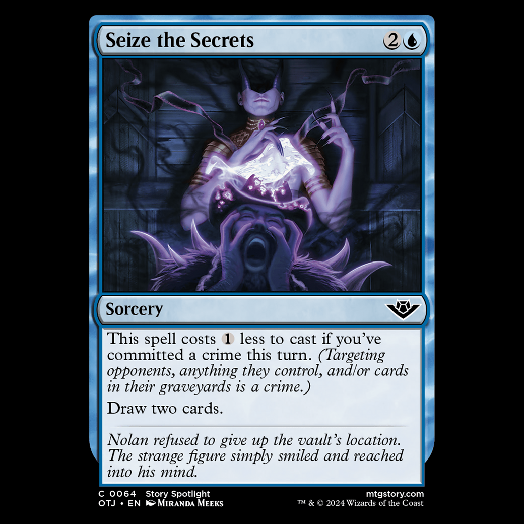 MTG Desentrañar los secretos (Seize the Secrets) Outlaws of Thunder Junction otj#64 This spell costs less to cast if you've committed a crime this turn. (Targeting opponents, anything they control, and/or cards in their graveyards is a crime.) Draw two cards.