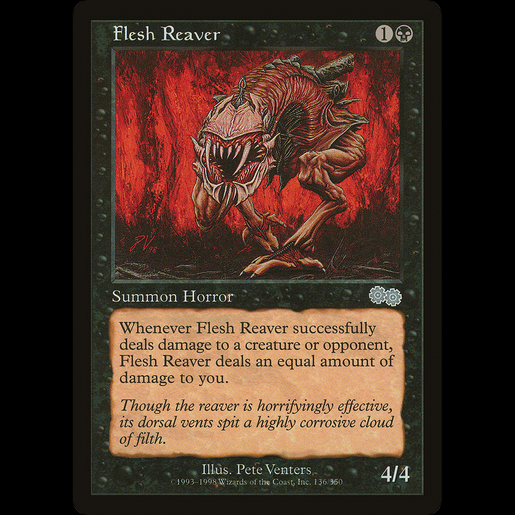 Whenever Flesh Reaver deals damage to a creature or opponent, Flesh Reaver deals that much damage to you.