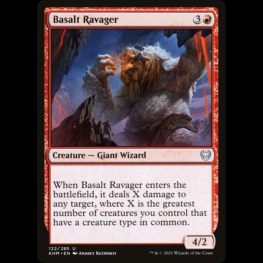 When Basalt Ravager enters, it deals X damage to any target, where X is the greatest number of creatures you control that have a creature type in common.