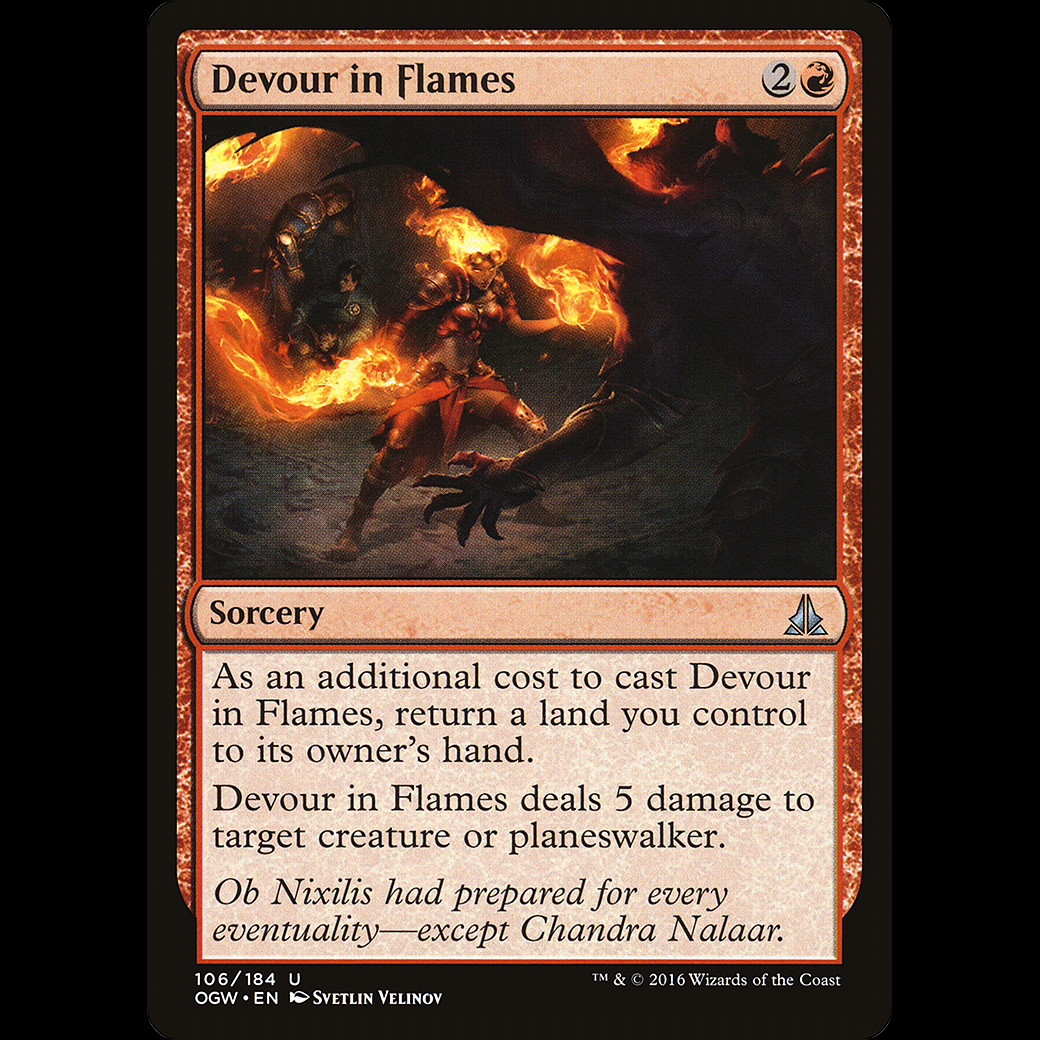 Devour in Flames deals 5 damage to target creature or planeswalker.