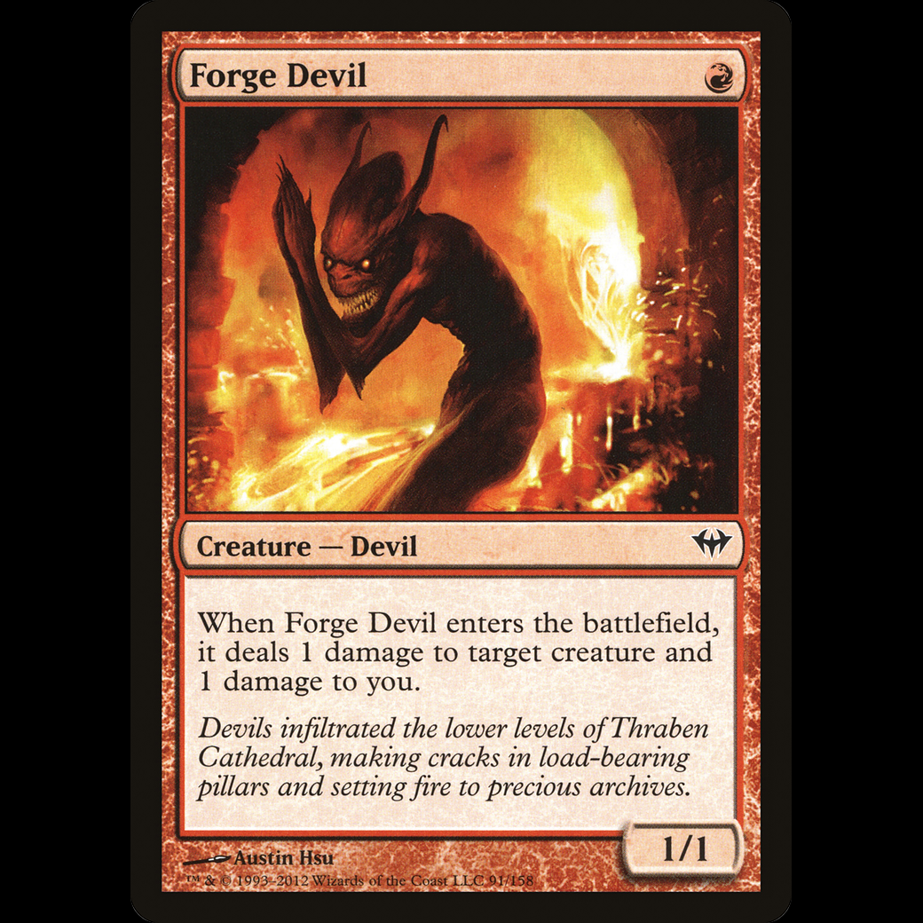 When Forge Devil enters the battlefield, it deals 1 damage to target creature and 1 damage to you.