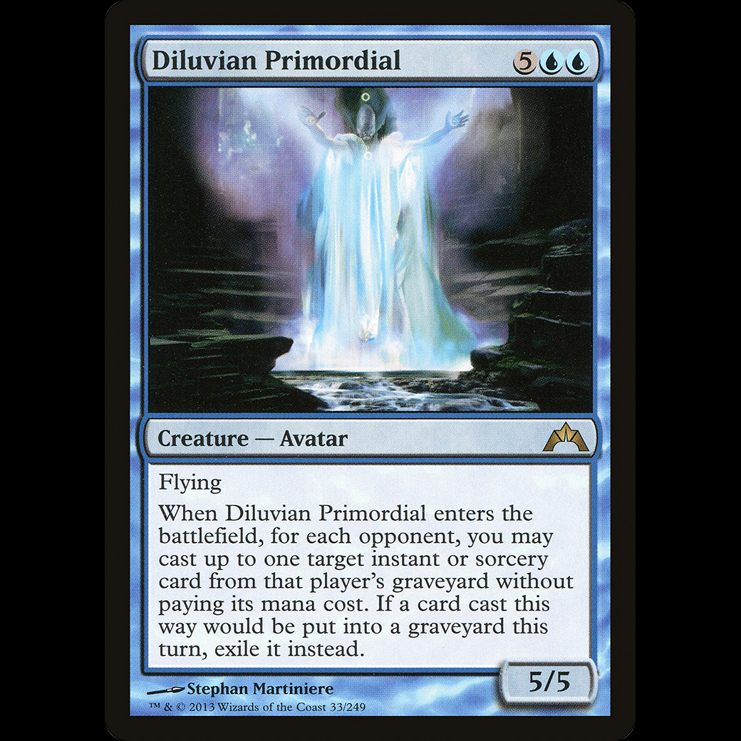 When Diluvian Primordial enters the battlefield, for each opponent, you may cast up to one target instant or sorcery card from that player's graveyard without paying its mana cost. If a spell cast this way would be put into a graveyard, exile it instead.