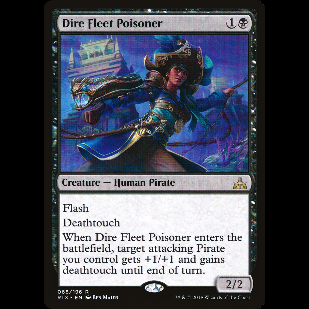 When Dire Fleet Poisoner enters the battlefield, target attacking Pirate you control gets +1/+1 and gains deathtouch until end of turn.