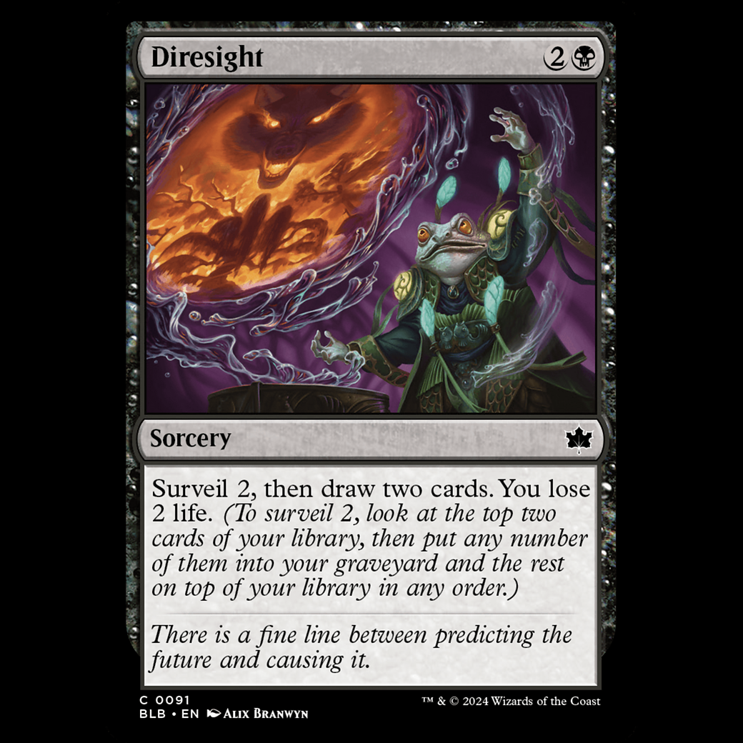 Surveil 2, then draw two cards. You lose 2 life. (To surveil 2, look at the top two cards of your library, then put any number of them into your graveyard and the rest on top of your library in any order.)