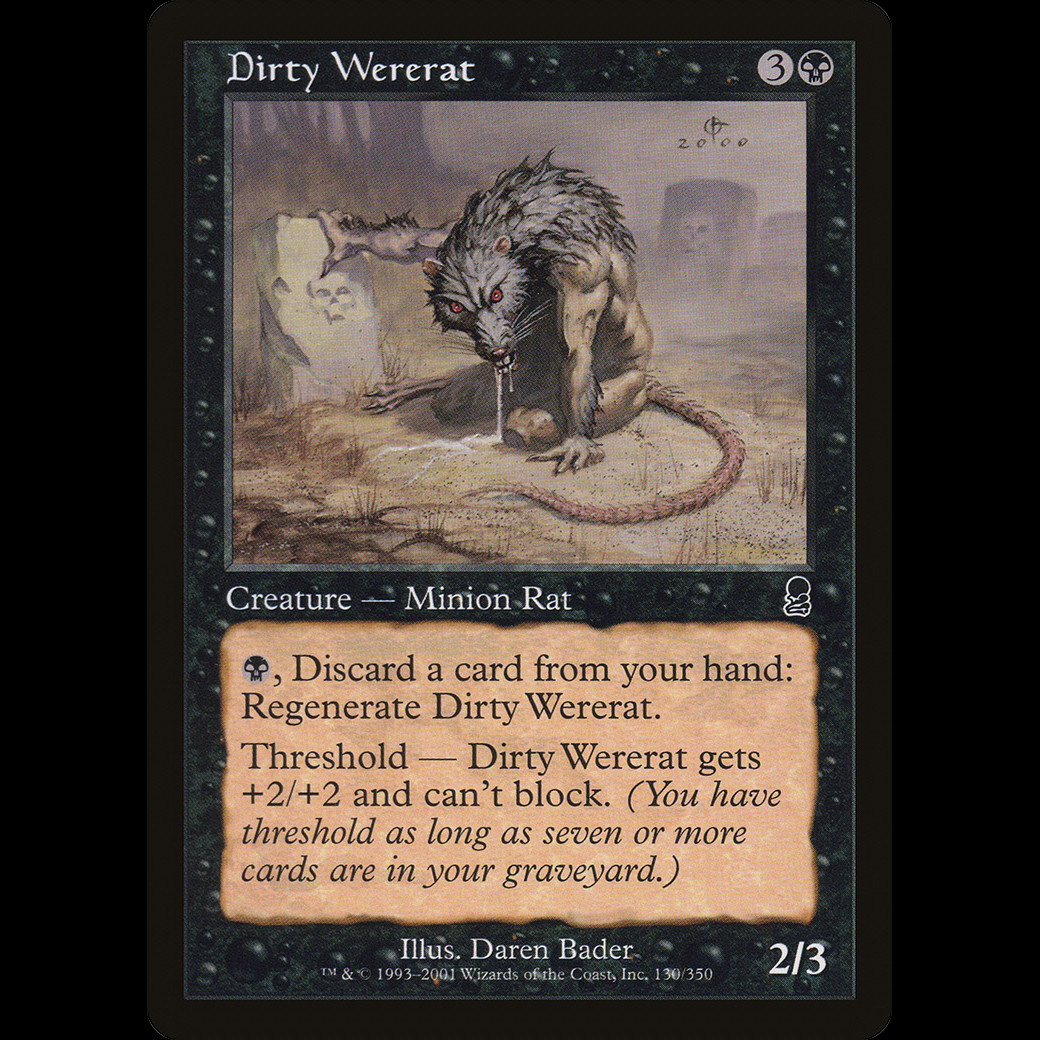 Threshold — As long as seven or more cards are in your graveyard, Dirty Wererat gets +2/+2 and can't block.