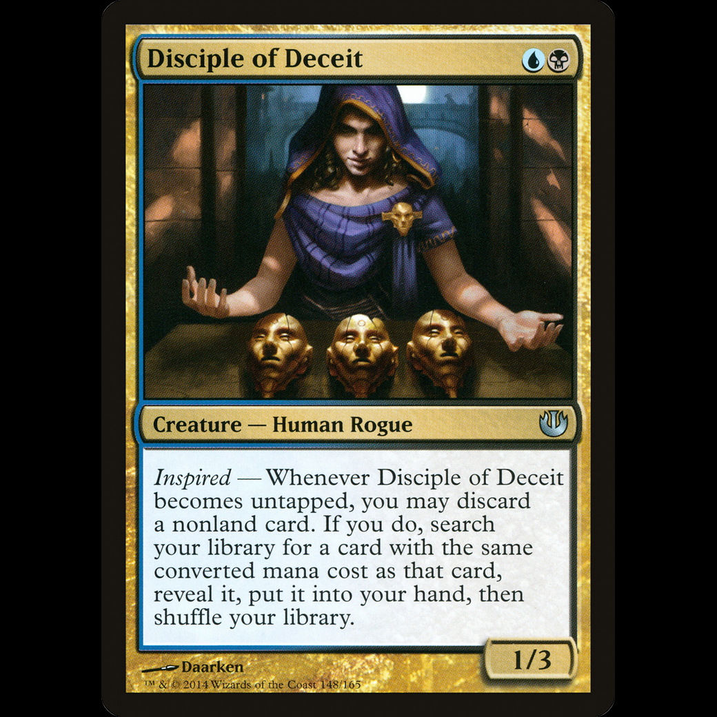 Inspired — Whenever Disciple of Deceit becomes untapped, you may discard a nonland card. If you do, search your library for a card with the same mana value as that card, reveal it, put it into your hand, then shuffle.
