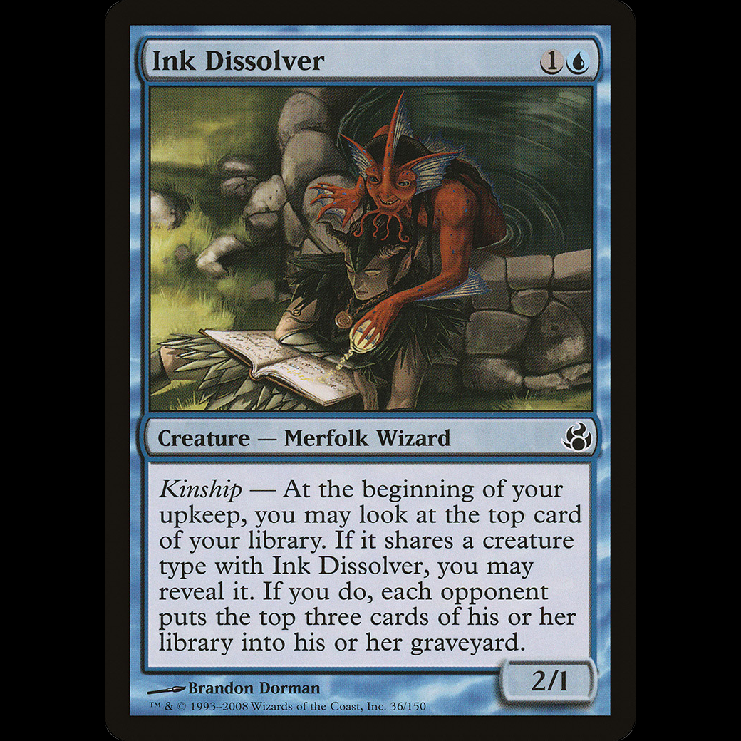 Kinship — At the beginning of your upkeep, you may look at the top card of your library. If it shares a creature type with Ink Dissolver, you may reveal it. If you do, each opponent mills three cards.