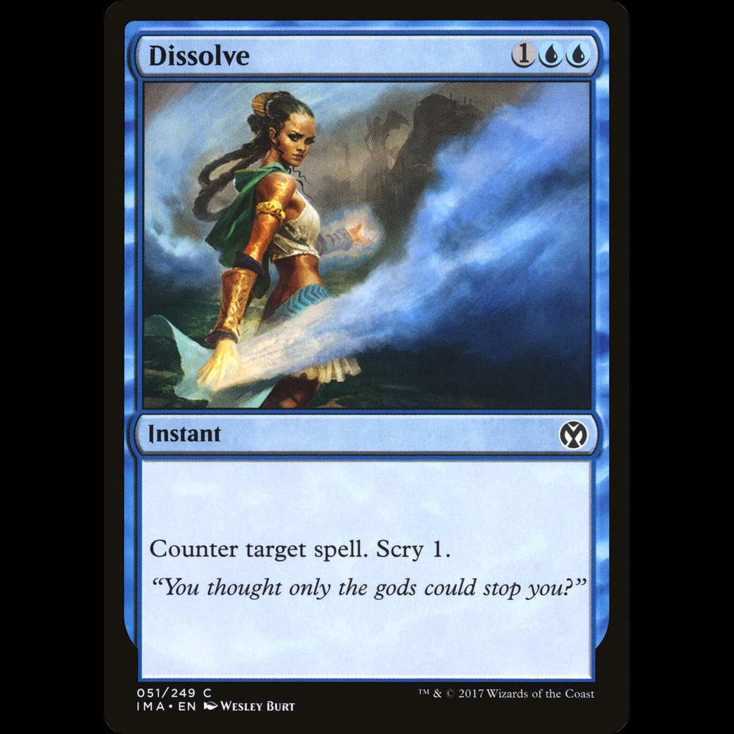 MTG Dissolve Iconic Masters ima#51Counter target spell. Scry 1. (Look at the top card of your library. You may put that card on the bottom.)