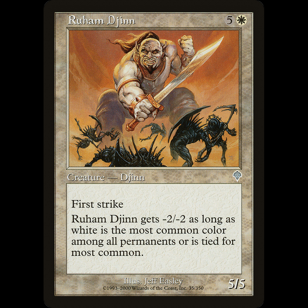 Ruham Djinn gets -2/-2 as long as white is the most common color among all permanents or is tied for most common.