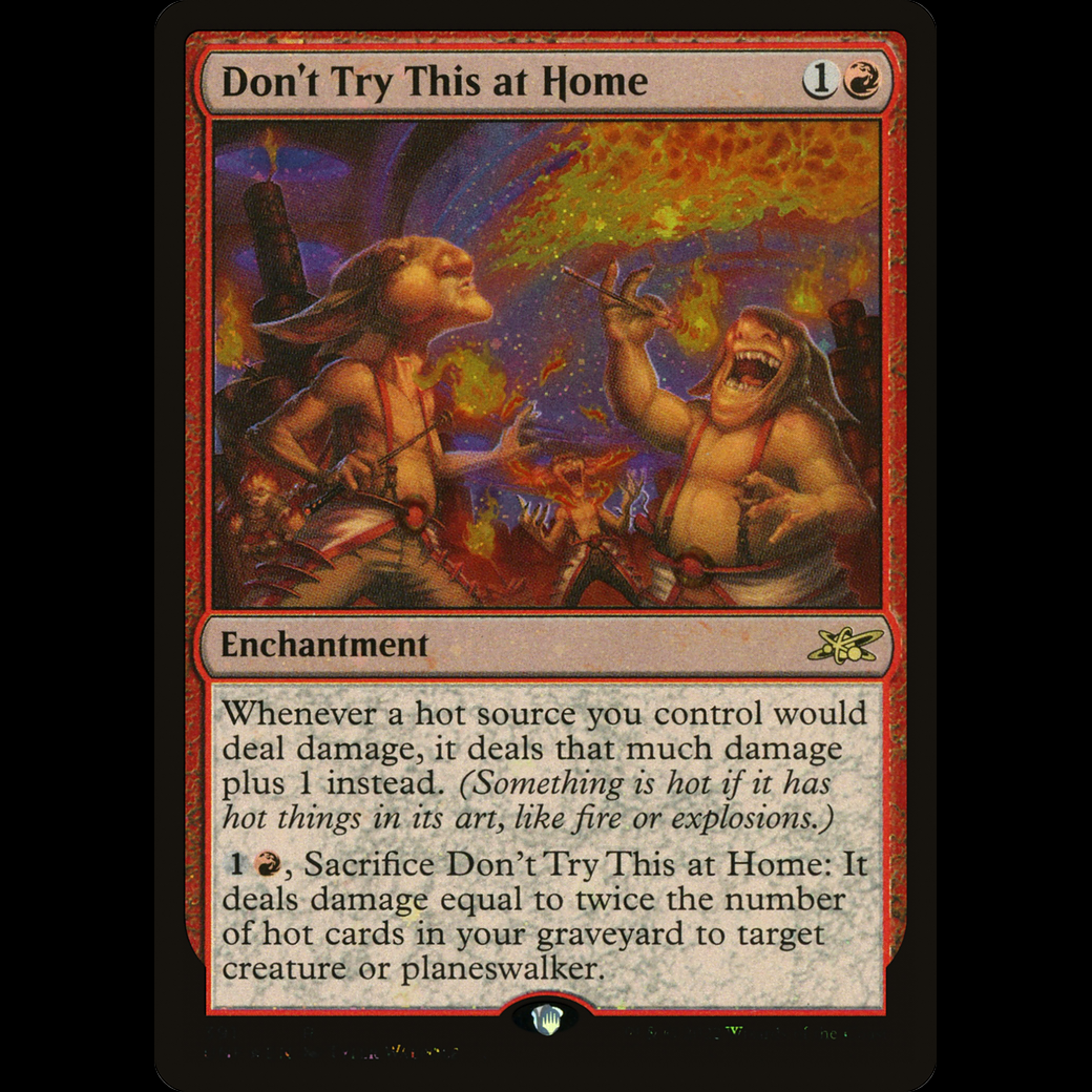 If a hot source you control would deal damage to a permanent or player, it deals that much damage plus 1 instead. (Something is hot if it has hot things in its art, like fire or explosions.)
