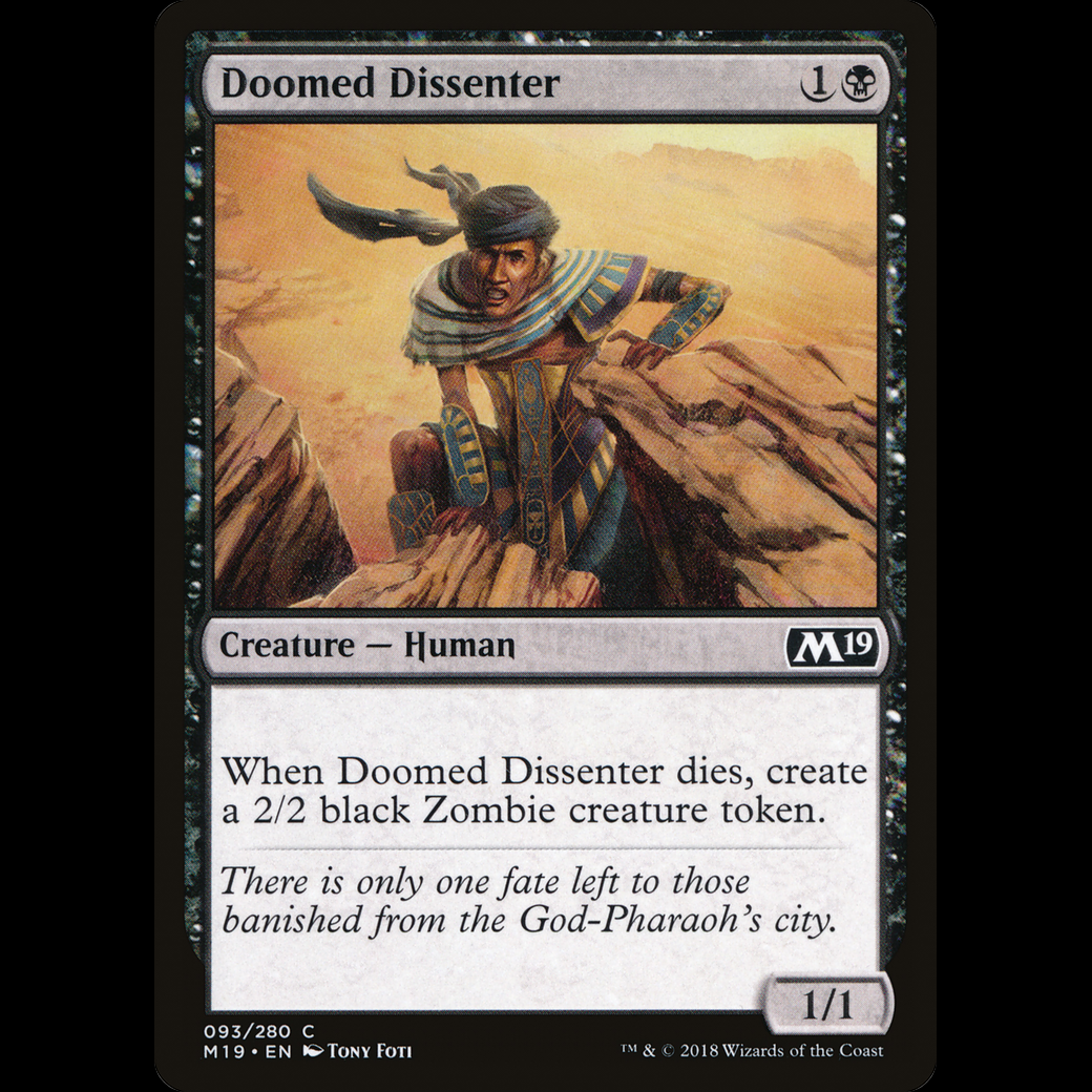 When Doomed Dissenter dies, create a 2/2 black Zombie creature token.