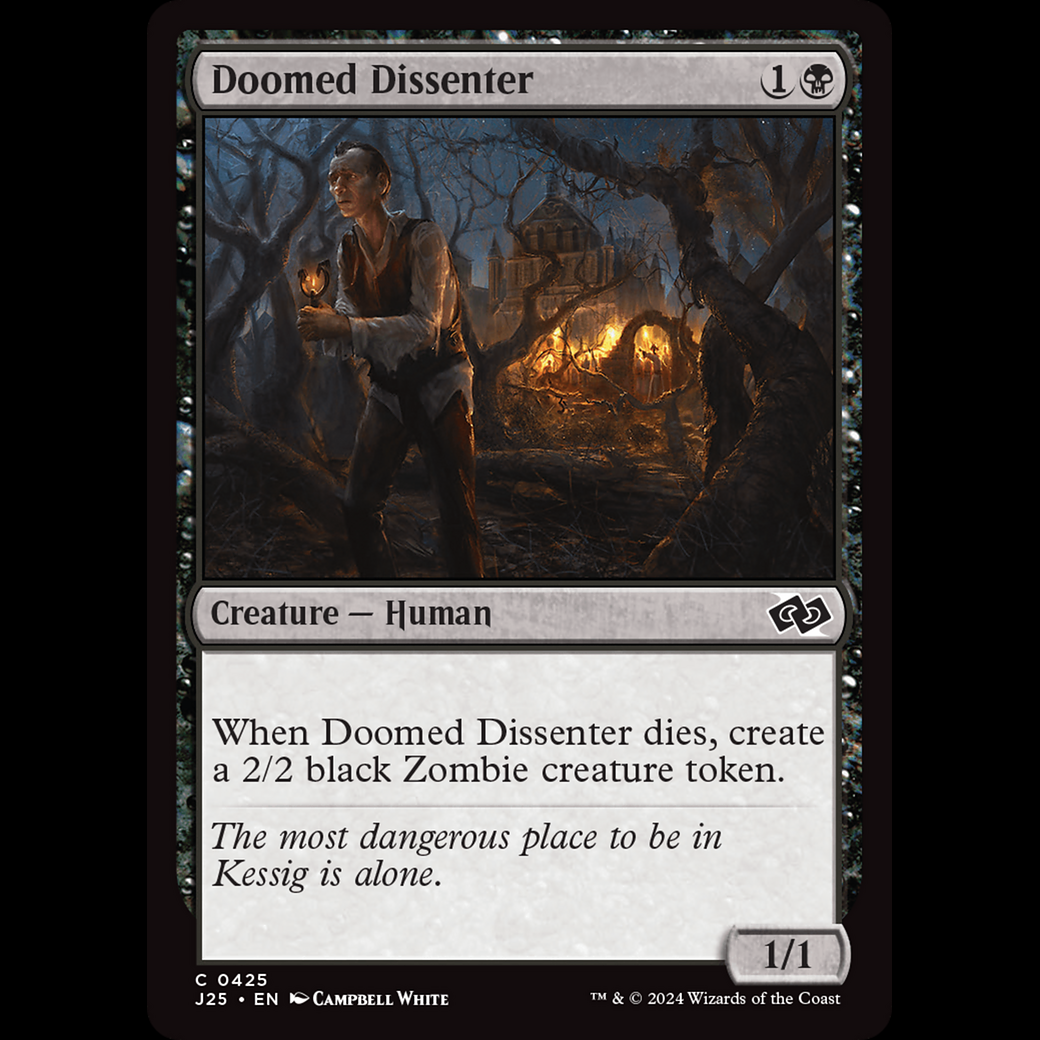 When Doomed Dissenter dies, create a 2/2 black Zombie creature token.