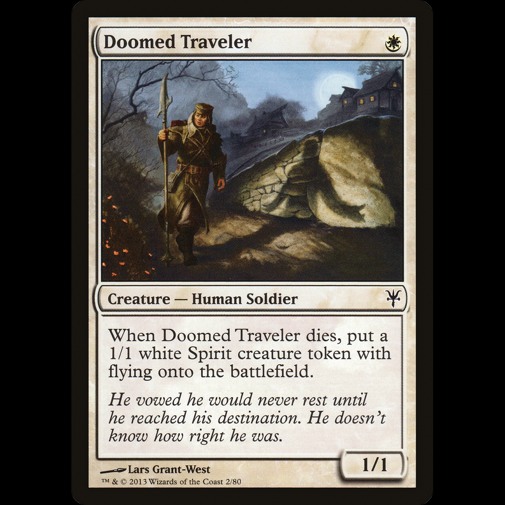 When Doomed Traveler dies, create a 1/1 white Spirit creature token with flying.