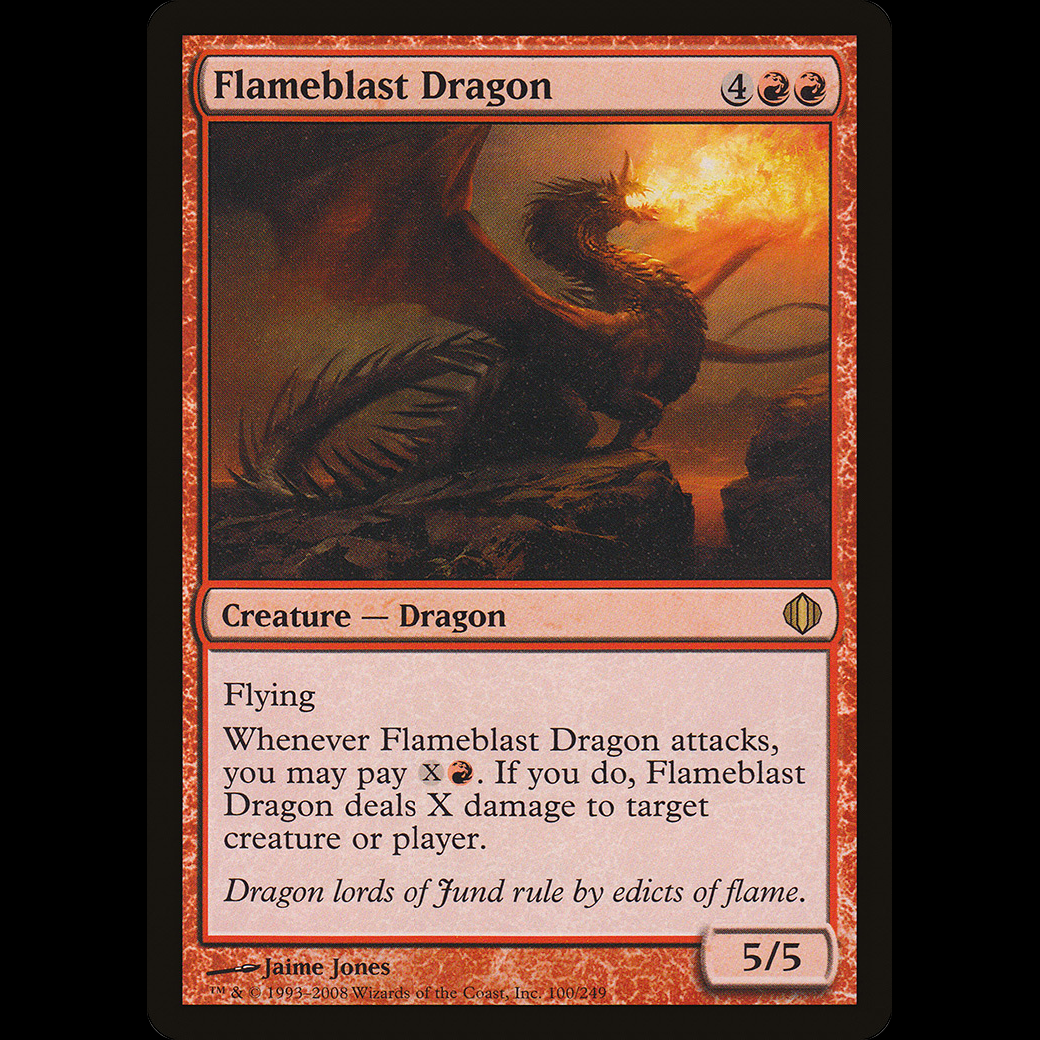Whenever Flameblast Dragon attacks, you may pay . If you do, Flameblast Dragon deals X damage to any target.