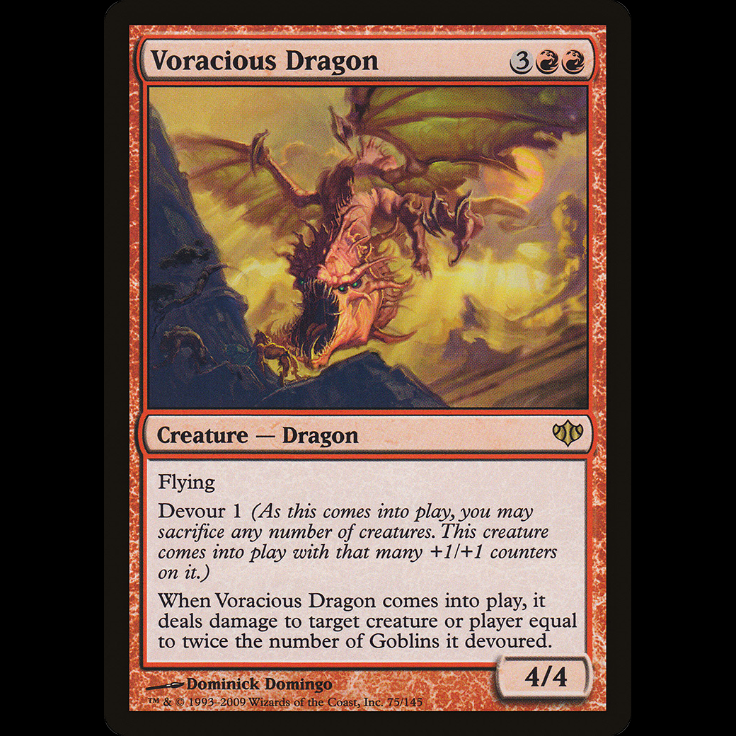 When Voracious Dragon enters the battlefield, it deals damage to any target equal to twice the number of Goblins it devoured.