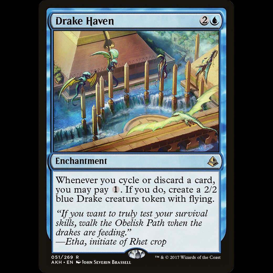 Whenever you cycle or discard a card, you may pay . If you do, create a 2/2 blue Drake creature token with flying.