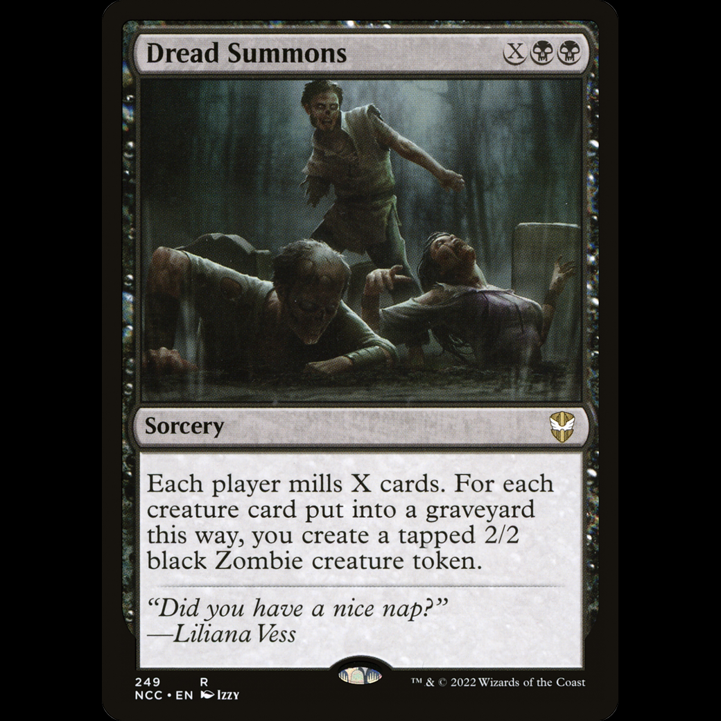 Each player mills X cards. For each creature card put into a graveyard this way, you create a tapped 2/2 black Zombie creature token. (To mill a card, a player puts the top card of their library into their graveyard.)