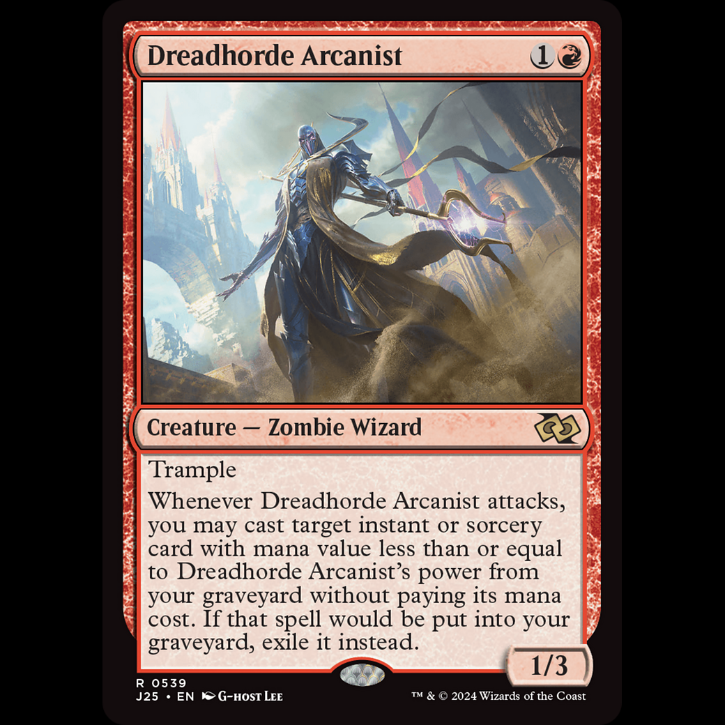 Whenever Dreadhorde Arcanist attacks, you may cast target instant or sorcery card with mana value less than or equal to Dreadhorde Arcanist's power from your graveyard without paying its mana cost. If that spell would be put into your graveyard, exile it instead.