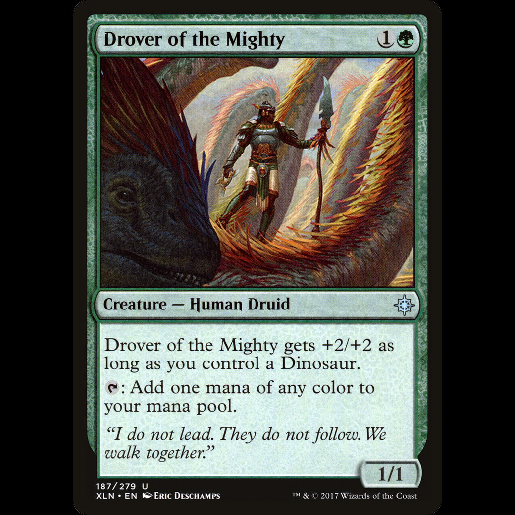 Drover of the Mighty gets +2/+2 as long as you control a Dinosaur.