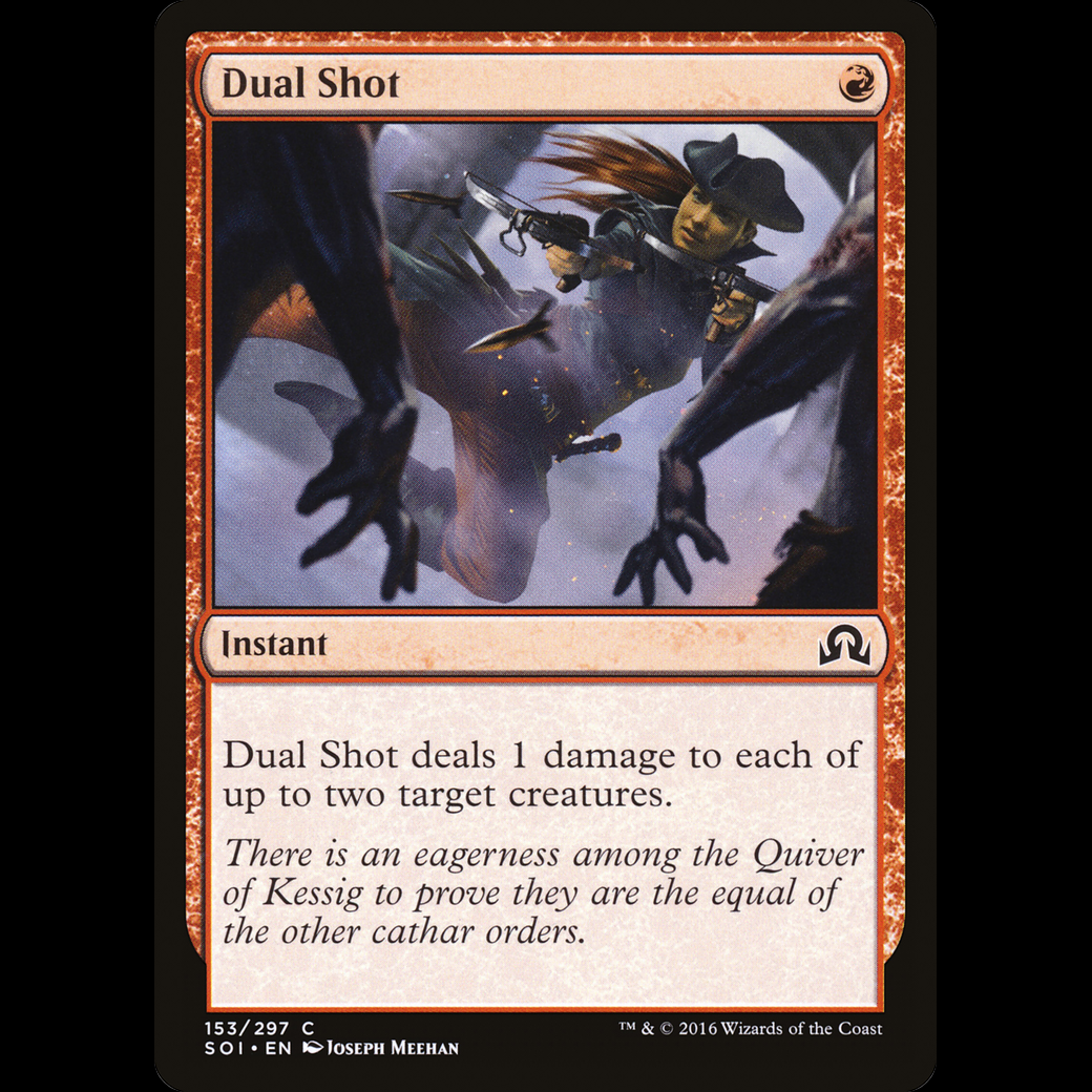 Dual Shot deals 1 damage to each of up to two target creatures.
