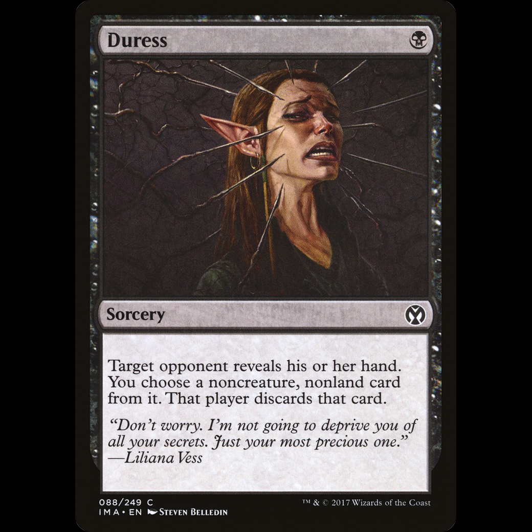 MTG Duress Iconic Masters ima#88Target opponent reveals their hand. You choose a noncreature, nonland card from it. That player discards that card.