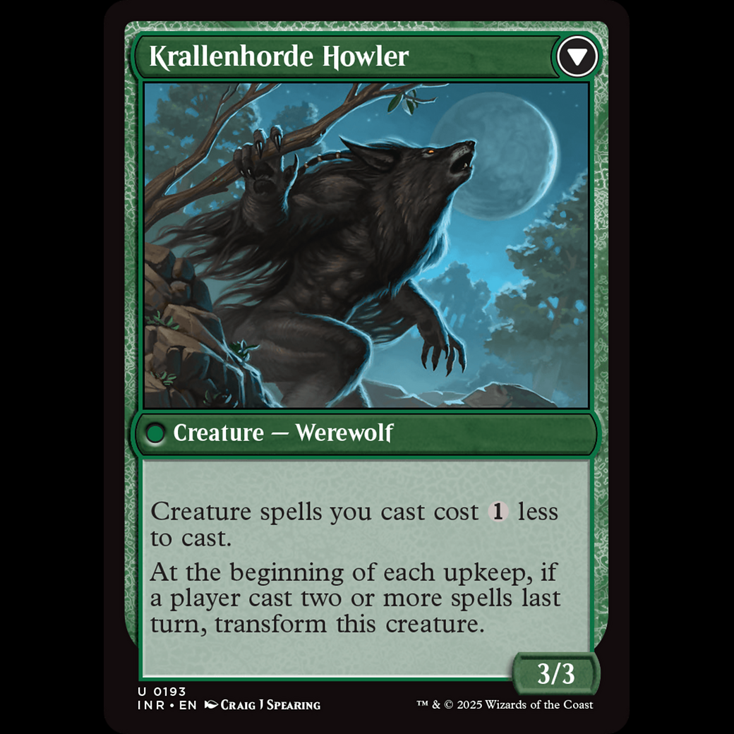 At the beginning of each upkeep, if a player cast two or more spells last turn, transform Krallenhorde Howler.
