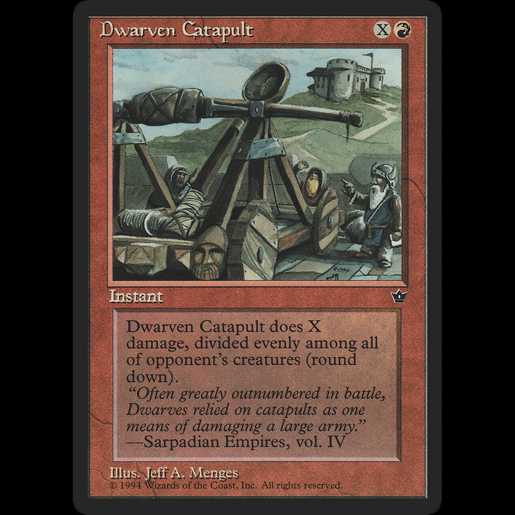 Dwarven Catapult deals X damage divided evenly, rounded down, among all creatures target opponent controls.