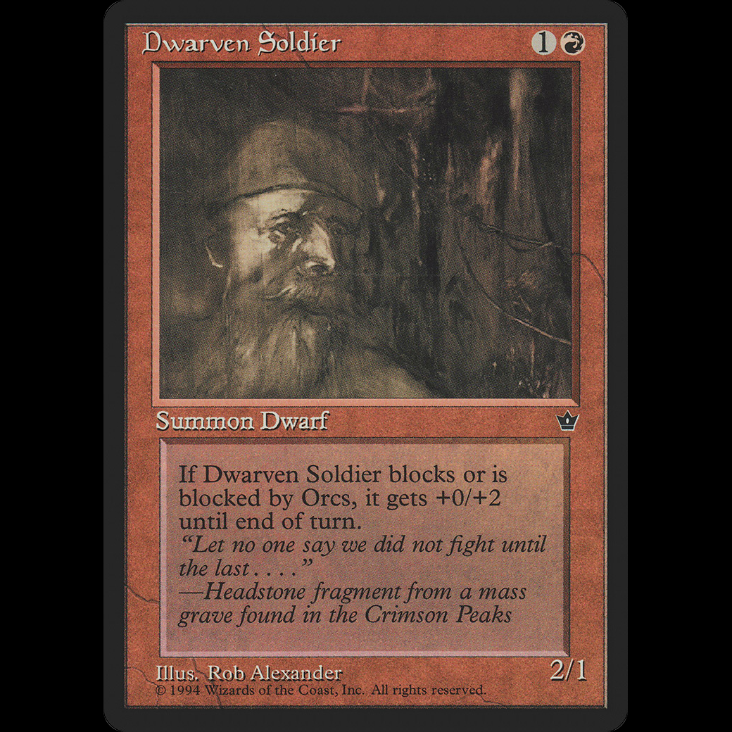 Whenever Dwarven Soldier blocks or becomes blocked by one or more Orcs, Dwarven Soldier gets +0/+2 until end of turn.