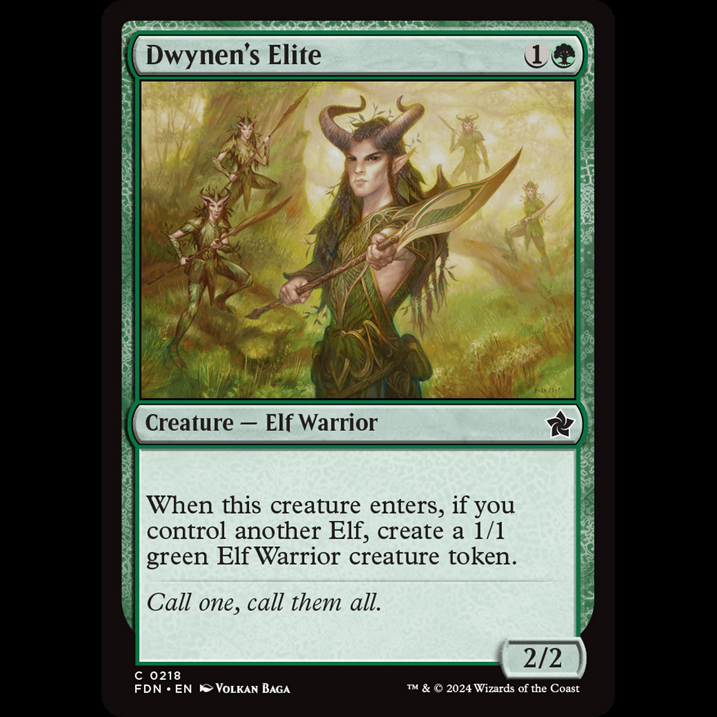 When this creature enters, if you control another Elf, create a 1/1 green Elf Warrior creature token.