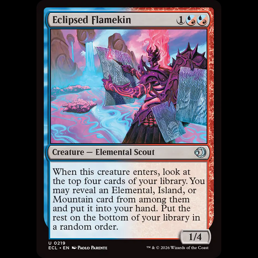 When this creature enters, look at the top four cards of your library. You may reveal an Elemental, Island, or Mountain card from among them and put it into your hand. Put the rest on the bottom of your library in a random order.