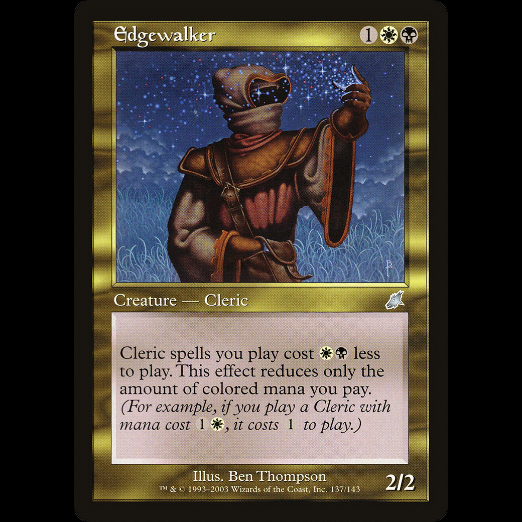 Cleric spells you cast cost less to cast. This effect reduces only the amount of colored mana you pay. (For example, if you cast a Cleric spell with mana cost , it costs to cast.)