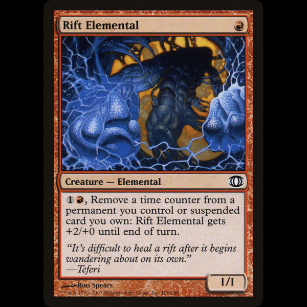 , Remove a time counter from a permanent you control or suspended card you own: Rift Elemental gets +2/+0 until end of turn.