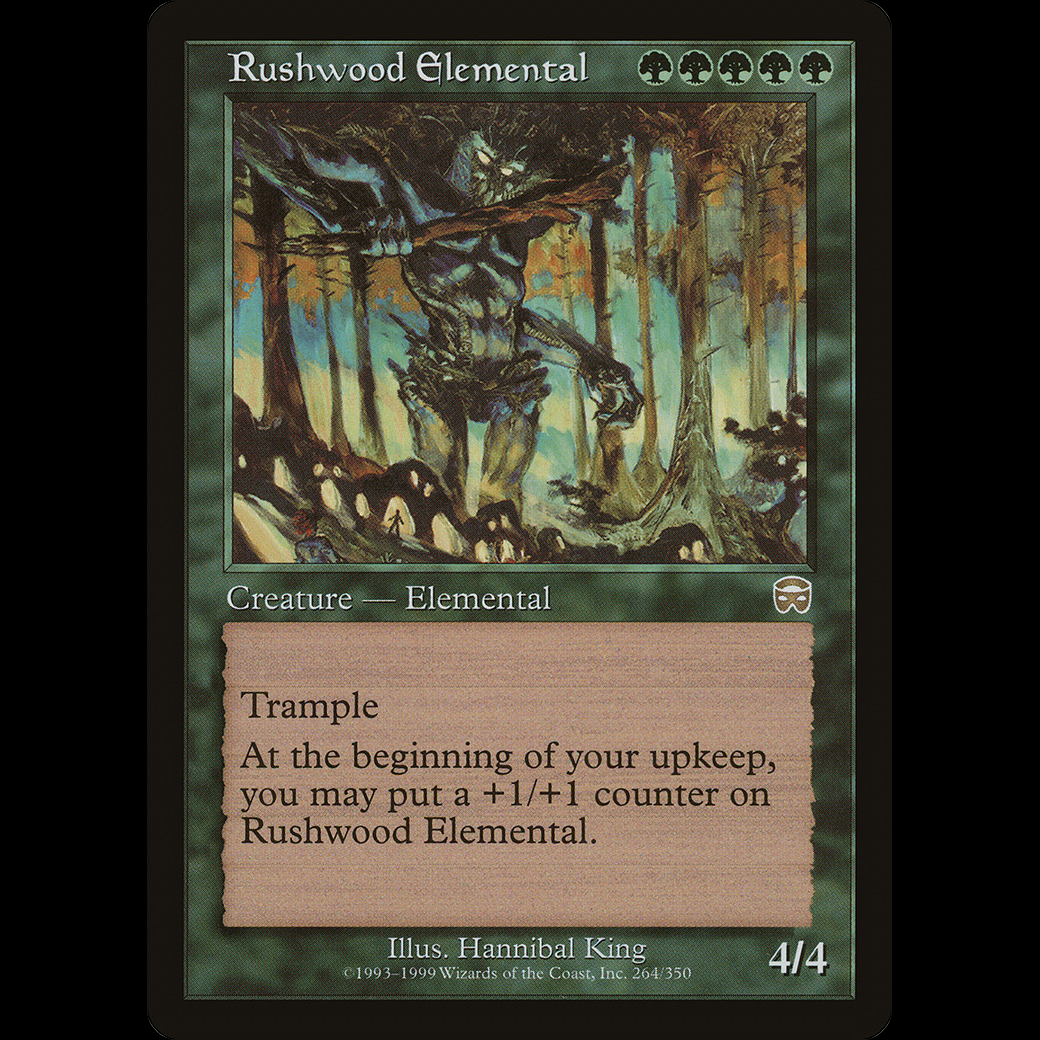 At the beginning of your upkeep, you may put a +1/+1 counter on Rushwood Elemental.