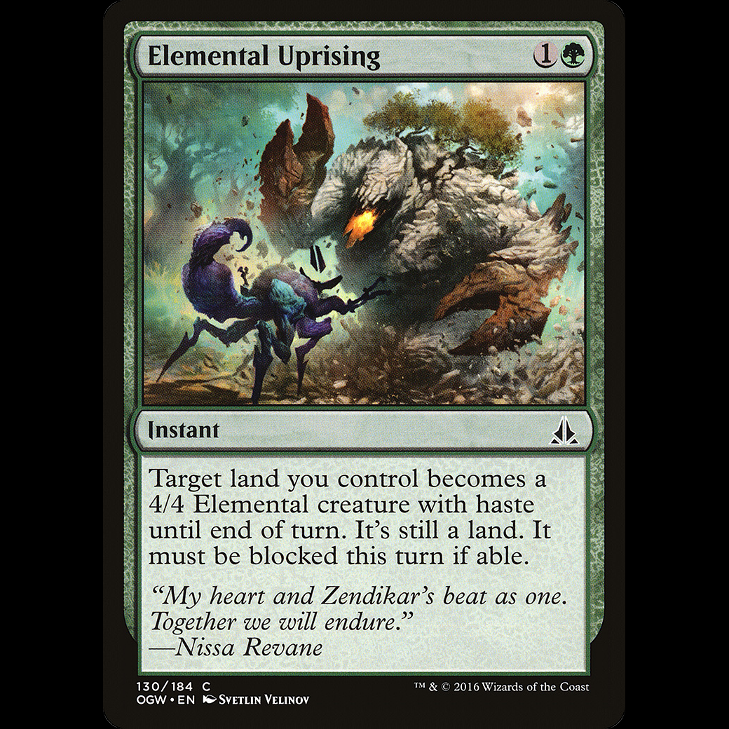 Target land you control becomes a 4/4 Elemental creature with haste until end of turn. It's still a land. It must be blocked this turn if able.
