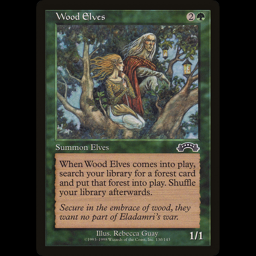 When Wood Elves enters the battlefield, search your library for a Forest card, put that card onto the battlefield, then shuffle.