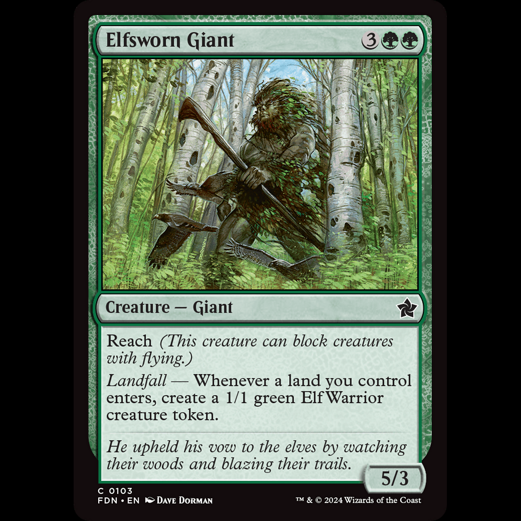Reach (This creature can block creatures with flying.) Landfall — Whenever a land you control enters, create a 1/1 green Elf Warrior creature token.