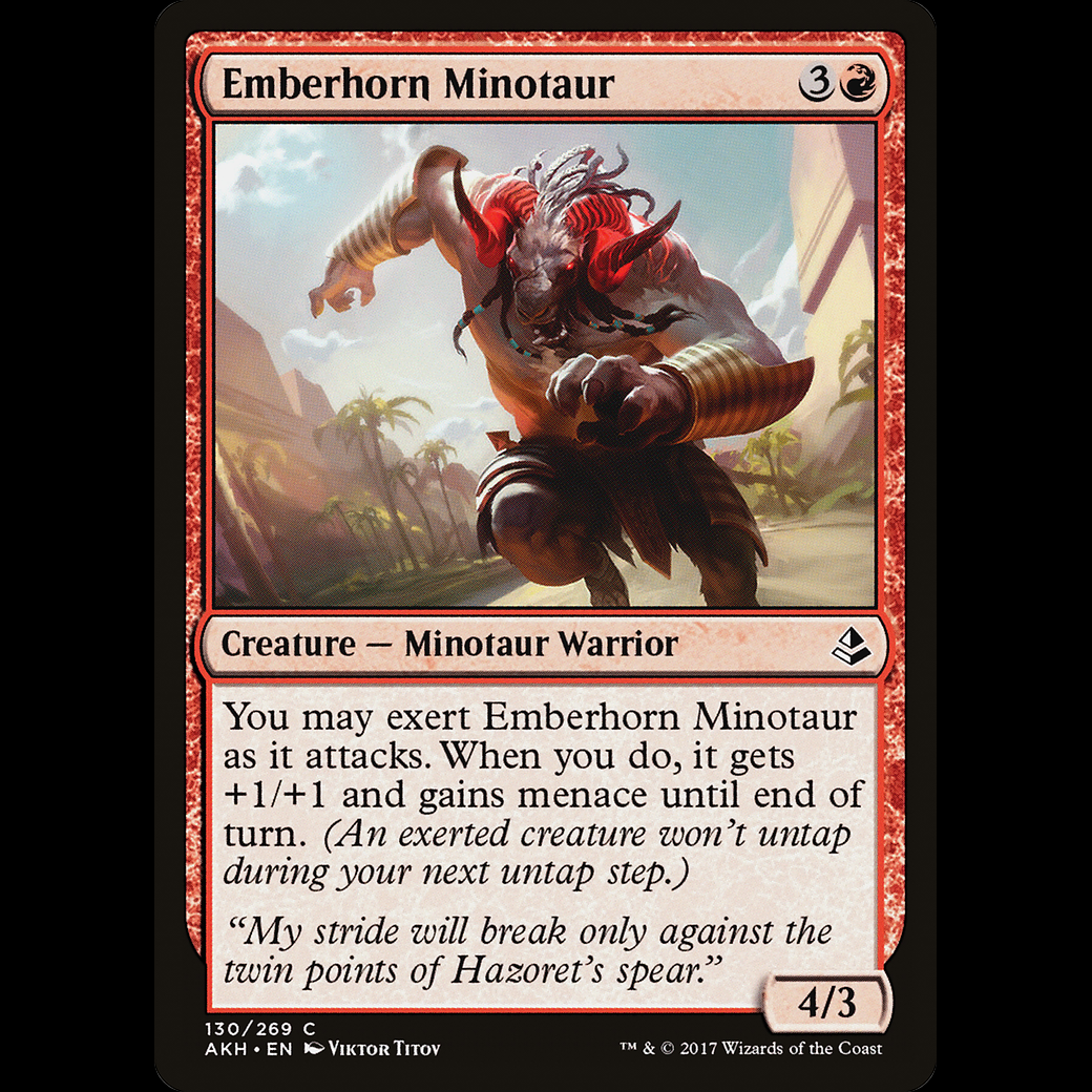 You may exert Emberhorn Minotaur as it attacks. When you do, it gets +1/+1 and gains menace until end of turn. (An exerted creature won't untap during your next untap step.)