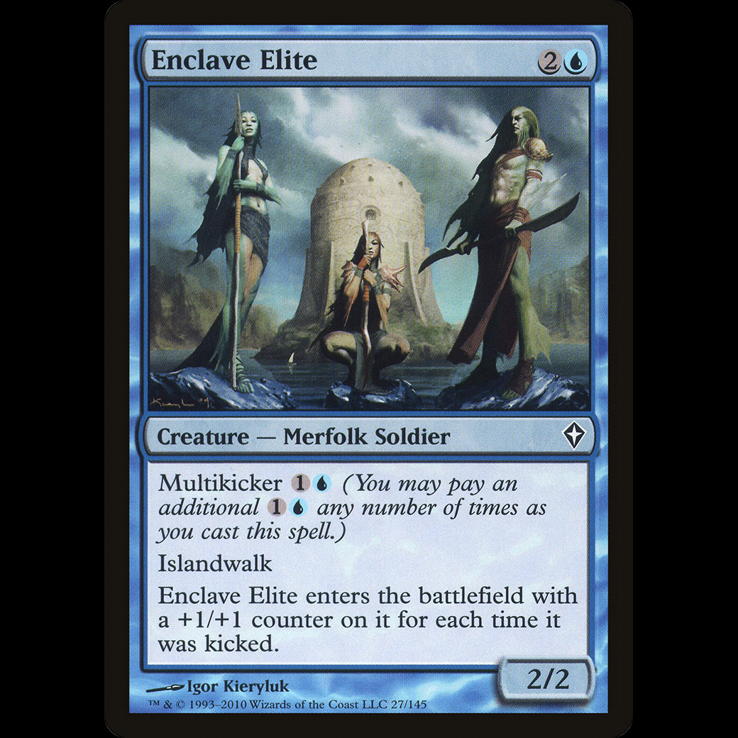 Enclave Elite enters the battlefield with a +1/+1 counter on it for each time it was kicked.