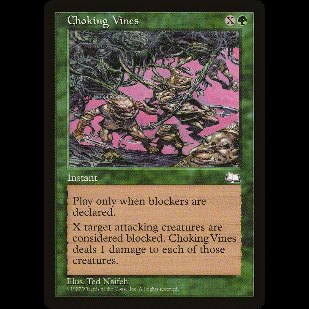 X target attacking creatures become blocked. Choking Vines deals 1 damage to each of those creatures. (This spell works on creatures that can't be blocked.)