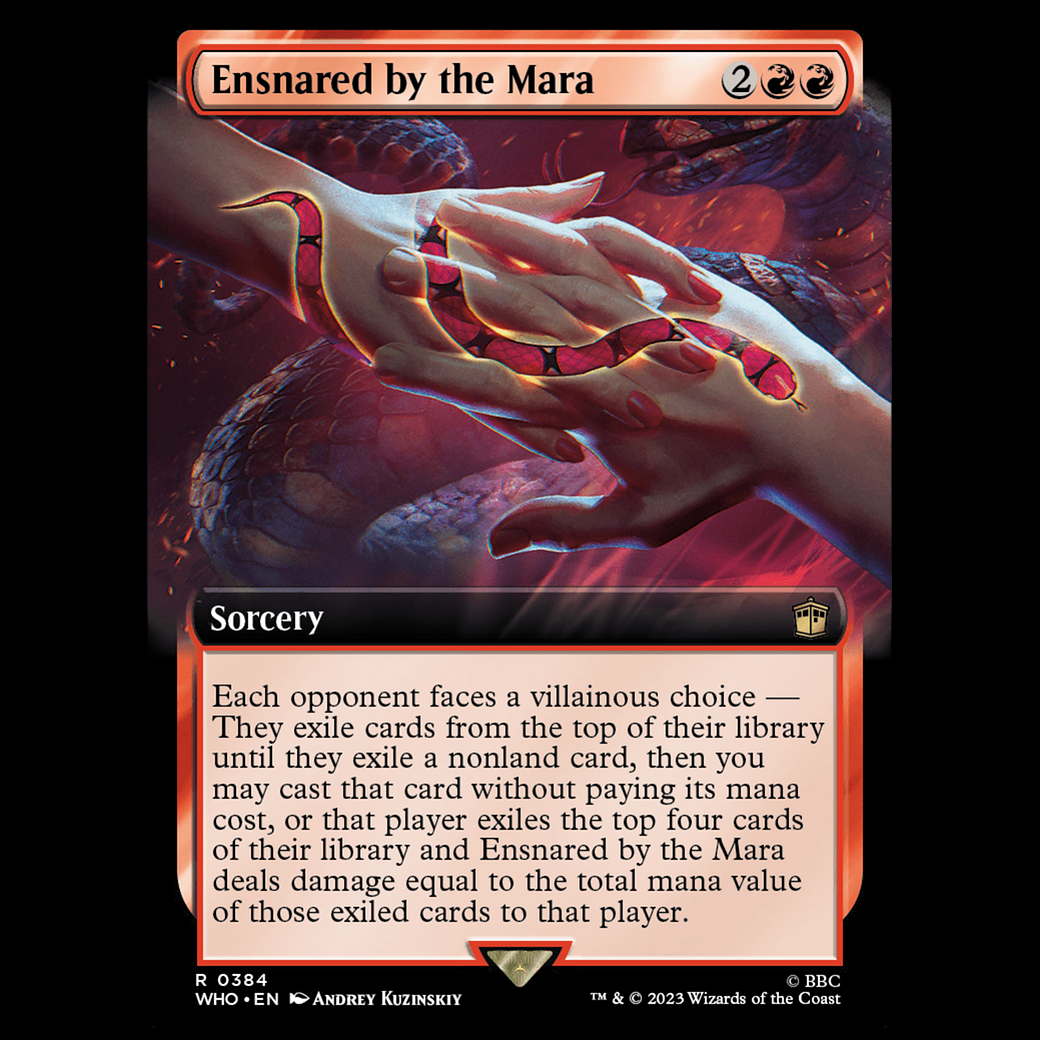 Each opponent faces a villainous choice — They exile cards from the top of their library until they exile a nonland card, then you may cast that card without paying its mana cost, or that player exiles the top four cards of their library and Ensnared by the Mara deals damage equal to the total mana value of those exiled cards to that player.