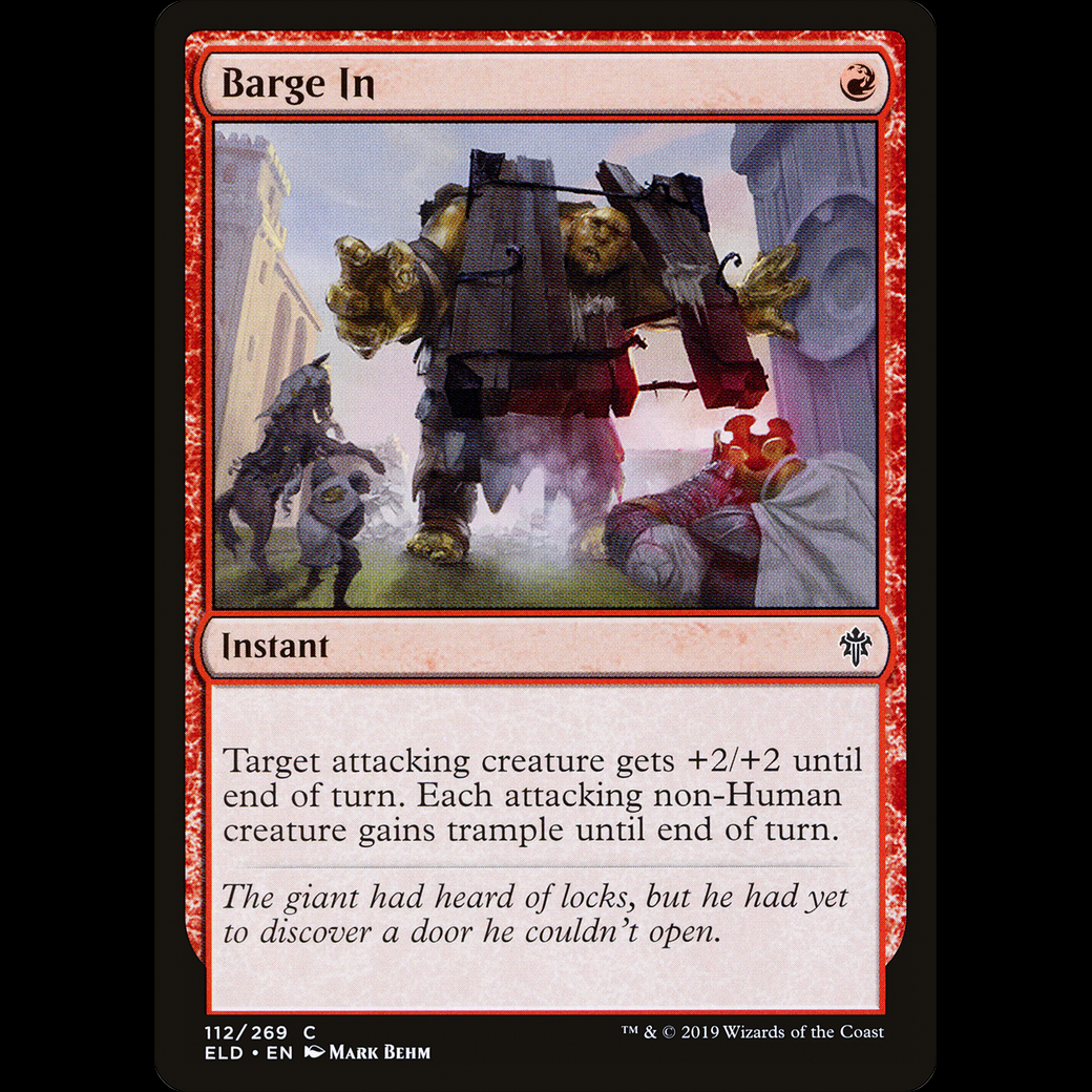 MTG Entrar por la cara (Barge In) Throne of Eldraine eld#112Target attacking creature gets +2/+2 until end of turn. Each attacking non-Human creature gains trample until end of turn.