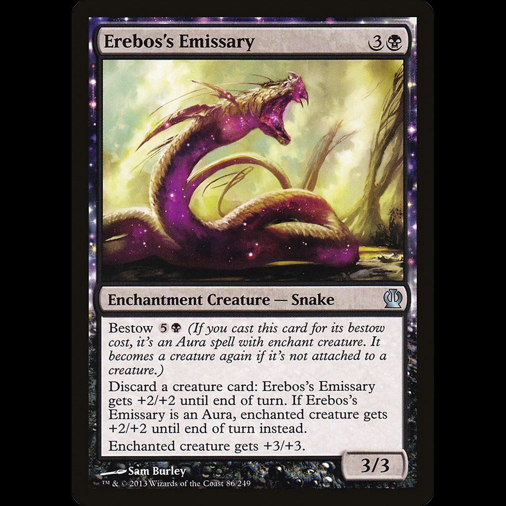 Discard a creature card: Erebos's Emissary gets +2/+2 until end of turn. If Erebos's Emissary is an Aura, enchanted creature gets +2/+2 until end of turn instead.