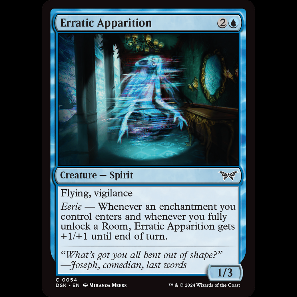 Eerie — Whenever an enchantment you control enters and whenever you fully unlock a Room, Erratic Apparition gets +1/+1 until end of turn.