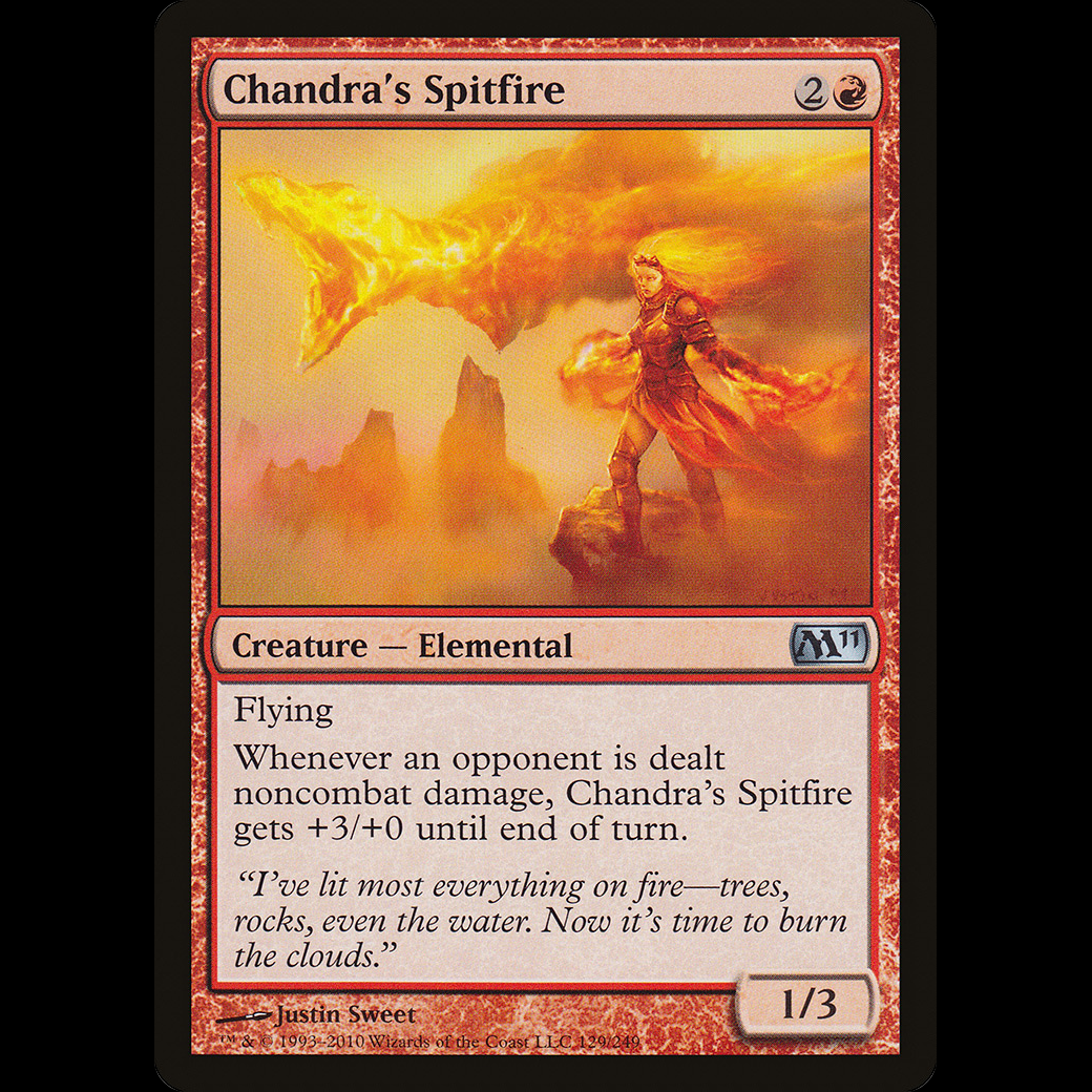 Whenever an opponent is dealt noncombat damage, Chandra's Spitfire gets +3/+0 until end of turn.