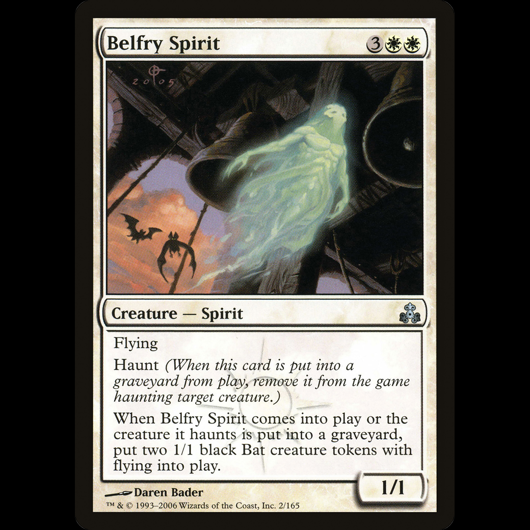 When Belfry Spirit enters the battlefield or the creature it haunts dies, create two 1/1 black Bat creature tokens with flying.