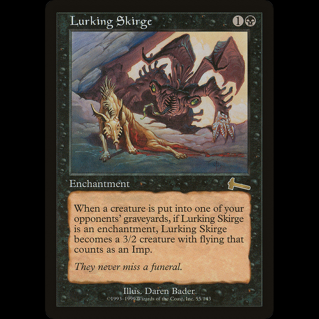 When a creature is put into an opponent's graveyard from the battlefield, if Lurking Skirge is an enchantment, Lurking Skirge becomes a 3/2 Phyrexian Imp creature with flying.