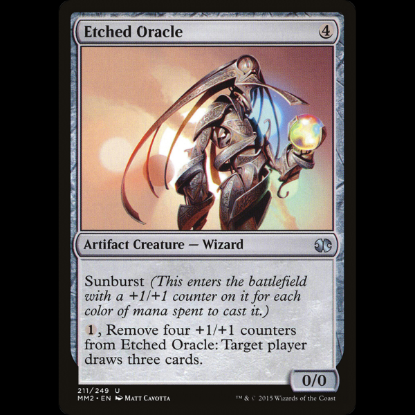 , Remove four +1/+1 counters from Etched Oracle: Target player draws three cards.