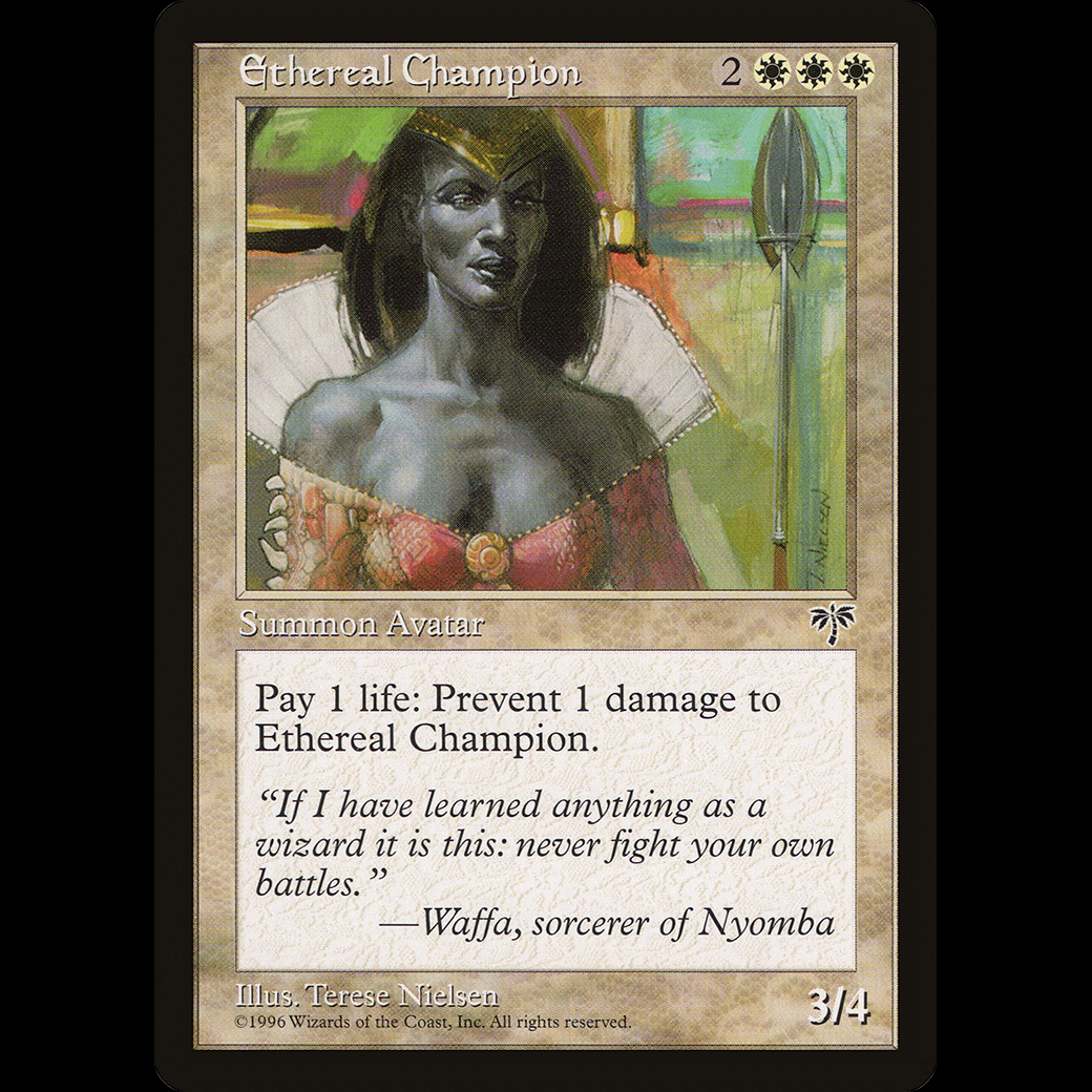 Pay 1 life: Prevent the next 1 damage that would be dealt to Ethereal Champion this turn.
